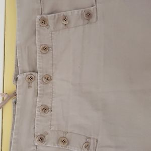 Size 6 khaki skirt. Sailor front. 1 of the buttons is only a half..but it is still functional ans isn't a problem wearing it. Laid flat, the waist is 17inches ans the length from top to bottom is 16.5 inches. Very good condition.