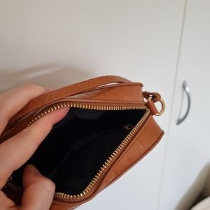 Mini Crossbody Bag with super long strap. Barely used, in great condition! Has gold detailing and hardware. Fits phone, cards and perfume. Perfect for going out!!