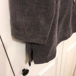 Very soft long gray jacket with two front pockets, 5 front button closure, 2 decor back buttons. Would look great with jeans or jeggings.
