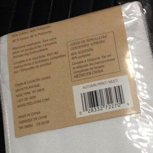 brand new Set of 4 Autumn Medley Napkins. Each is 17 inches x 17 inches square. Pumpkins, Berries, and Grape Leaves printed on an ivory woven damask fabric that is 60% Cotton and 40% Polyester fabric which is machine washable. Condition is brand new, factory-folded in unopened, undamaged, original retail packaging ... UPC 028332722704.