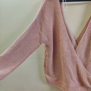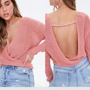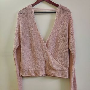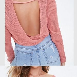 Forever 21 Blush pink plunging chunky sweater with open back. For a modest look pair it with a t-shirt/ warmer underneath and layered chains. Really cute.