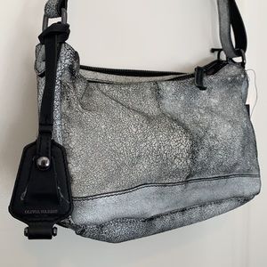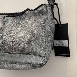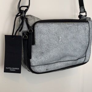 Revel in this biker-styled Olivia Harris bag with street-characterized leather and an edgy zipper detail.