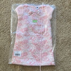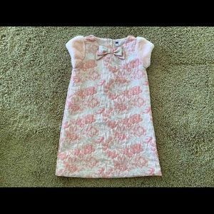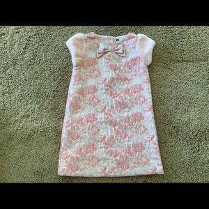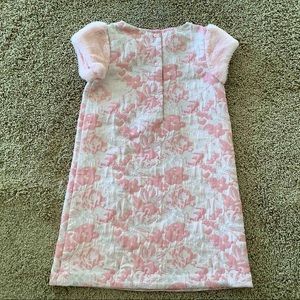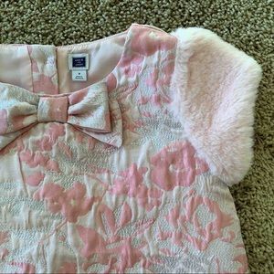 Pink and silver flowers on white dress with pink fluffy sleeves
