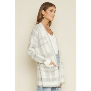 The daydream plaid pocketed knit cardigan will elevate your fall outerwear! This white and gray piece features an open front, long sleeves and two front pockets.