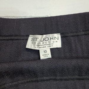 New St. John Sweater Skirt Set. Black and white wool and silk blend knit jacket with white lace trim at hem and cuffs. 3/4 length sleeves. Front closure with one silver St John logo button. Matching St John Collection black ribbed knit pull on pencil skirt. Brand New Never Worn!! Excellent Condition!! Fast Shipper!