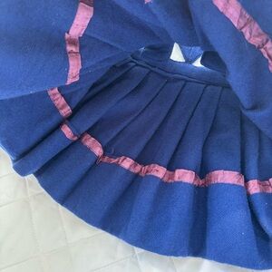 A beautiful unique festive vibrant navy blue skirt with adjustable suspenders. Beautiful floral embroidery on the heart piece. Elegant and unique with a touch of traditional Dutch aesthetic. Similar to the texture of felt <3
