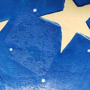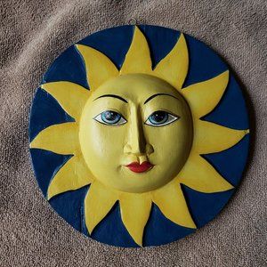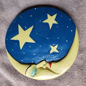 Two sided hanging mobile, one side is the sun, the other side is the moon and stars, is light weight and has a small hook on top to hang; measures approx 7.5"; sticker glue residue on one side, see all pictures