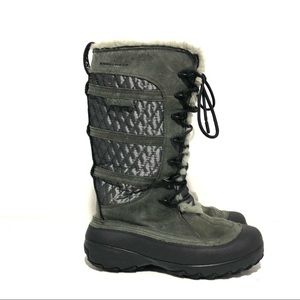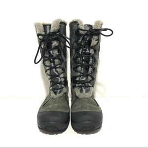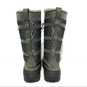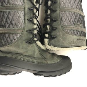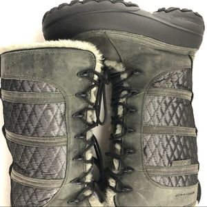 Grey on grey Omni Heat tie front quilted side leather snow boots. Faux fur lined with minor flattening. Thick traction bottoms. A great addition to your cold weather apparel! Size 8, they run just shy of 8 imo, roomy width but I think best for 7.5 - small 8 if you want to wear a thicker sock. Good condition.