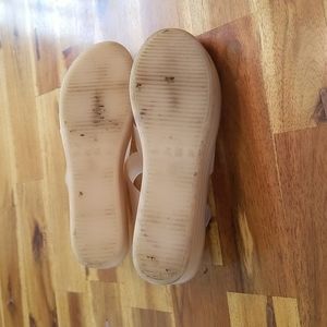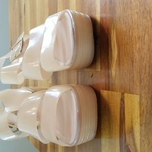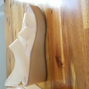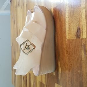 Refresh blush pink jelly platform sandals with big gold buckle siding. Item is used and has some blemishes through out but no major damage. Light black markings on straps and side of right shoe. Front left strap has a small gouge. All is pictured above.