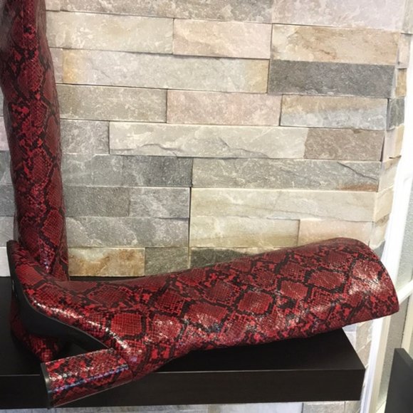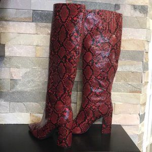 Refresh your look with the bold retro style of a knee-high boot featuring a pointed toe and glossy snake pattern.