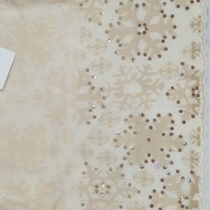 "Festivi-tees" Liz Claiborne crew neck cream sweater with ombre-style snowflake design in latte and tan.. Iridescent sequins are sewn on snowflakes on the front and back. Scalloped-knit rolled hem and bottom and ribbed crew at neck.