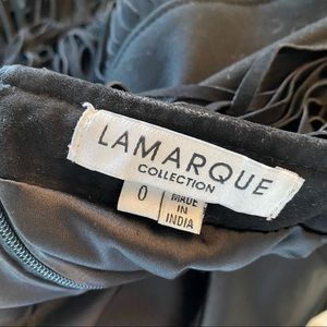 Suede friended skirt from LaMarque. Size 0, but could better fit a 2-4. Lining is stretchy and mini in length. Layered fringe goes to the knee. Heavy and luxe. Hook and zip back closure. Life of the party.