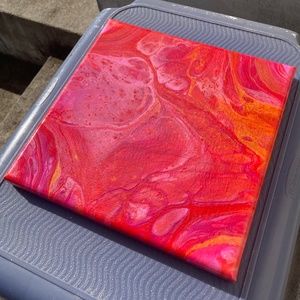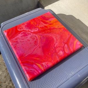 This is a beautiful acrylic paint pour on a 8”x8” square canvas with a glossy finish. I include hardware in your order to hang it on your wall as well as a meaning card.