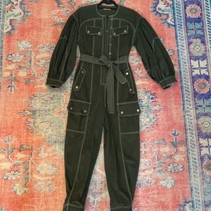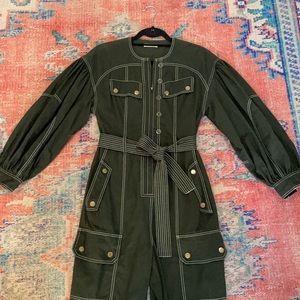 100% cotton. Front zipper closure and belted waist. Button closure with button accents. Detachable belt. Pockets with snap button closures. Twill fabric with contrast stitching.
