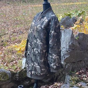 Max Studio London Horse Print Camouflage Puffer Jacket Size Large. I love the bright orange lining and please understand I am not advertising that it is reversible. It is not! I purchased this at Macy’s.