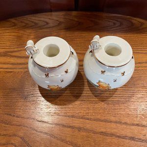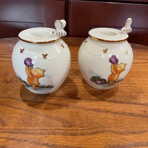 Lenox Pooh Honey Pot Candlestick holders. This is a set of 2. Each holder measures 3 1/2 inches tall at the bee and it measures 2 inches wide at the bottom. They are both in excellent condition with no chips and no cracks. These are based on the "Winnie the Pooh" works by A.A. Milne and E. H. Shepard.