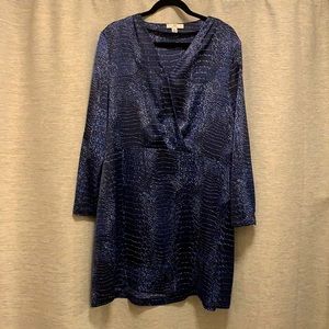 Halston Dark Blue Snake Skin Pattern Longsleeve Dress- Silk texture, V-neck crossover, Size- Large