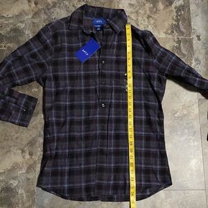 TWO Men’s Flannel Slim Fit Shirts. One with tags the second is ‘New Without Tags’. Original price is $46 each. 100 percent cotton. See pictures to see measurements. One is lighter and darker purple. The second is blue/green with touch of purple and black. From a smoke free household.