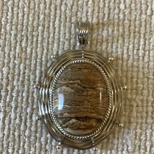 Picture Jasper Pendant, Lovely Tan and Brown Striations, Marked .925 Silver, Made in Indonesia, Many Silver Details, Measures 3 Inches Bale to Bottom of Pendant, 2 Inches Across, Back of Pendant Encased in Silver, Substantial Piece.