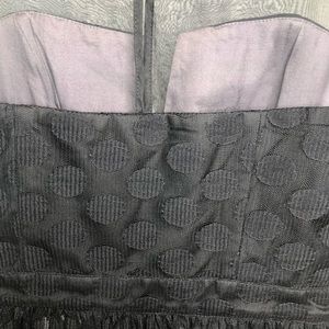 The skirt is a full flared design crafted from a sheer black fabric with large black dots