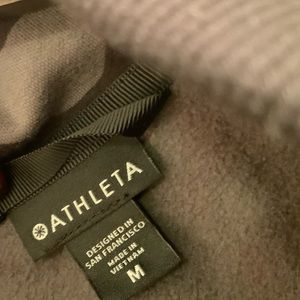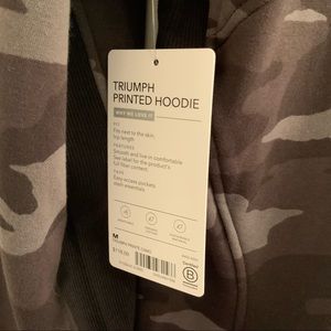 This is a brand new with tags Athleta Triumph Printed Hoodie. Size Medium. The pattern is Triumph Printed Camo. 49% polyester, 44% cotton, 7% spandex.