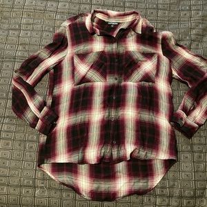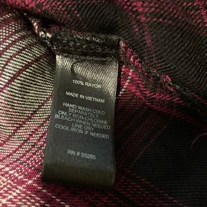 Has a hole at the shoulder. 100%rayon very softs you can roll and button sleeves. Size small