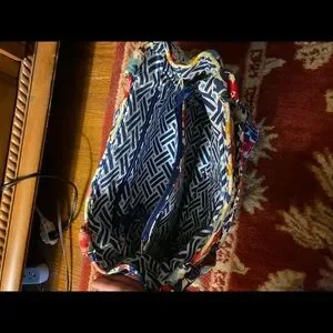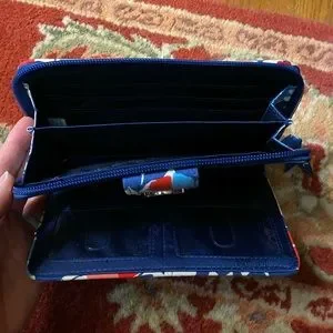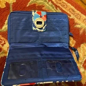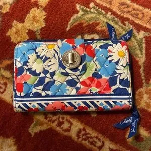 Vera Bradley Purse and matching wallet: red, blue, pink, green, yellow. Purse: two sections inside, two zippered pockets two open pockets. Snap front closer with outside pockets. Wallet: zippered closed side and clasp closed side.