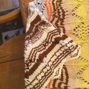 Stunning open knit wavy design sweater comes to you from Free People in Coral Reek. Crew neck design, scalloped hemline and 3/4 bell sleeves. Gorgeous hues of corals, browns and yellow in a one of a kind show stopping knit blend of cotton. Length 17.5 inchesβ€οΈ