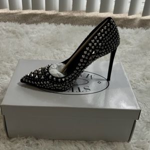 Rockstar or not!! Steve Madden® Verve Studded Pump will make you the star of any room!! Glamour with edgy attitude. Mixed metal embellishment adorn this pump silhouette, characterized by a pointed toe and sharp stiletto heel.