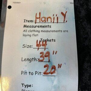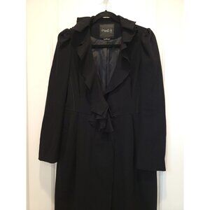 Beautiful, elegant and classic Hanii Y design. This Hanii Y Black Wool Princess Seam Coat. This isn’t a heavy wool weight. It is a perfect weight for chilly weather but not super freezing winters. Gathers at shoulder, ruffle trim at neck, top stitching pleats at waist. Hidden front hook & eye & single button closure, fully lined. 70% wool, 20% nylon, 10% Lycra. Retail $800