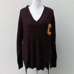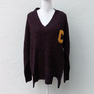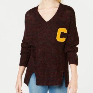 New with Tags Ultra Flirt Ladies Varsity Letter V-Neck Pullover Long Sleeve Sweater, Burgundy with Yellow C Letter #393