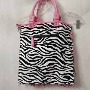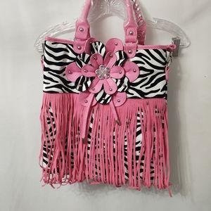 New. Reduced to final offer. Has room in here for everything you carry... Great gift. Brand New Cowgirl Trendy Bag with black and white zebra stripes and pink fringe, handle and strap. Beautiful flower and rhinestones as accent. Handles and adjustable strap. High quality Western Bag made of polyurethane leather exterior. 1 inside compartment, 1 zipper on back. Top zipper closure. All the room you need inside. Big purse. Final Price on New Bag.