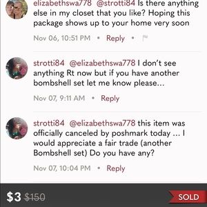 @angeliquezanon she’s never tried to make it Rt & I even commented under an item she had listed (after saying she needed to check with her daughter l, she removed the item)…as of to date NO WORD from her. Again, she for a brand new Bombshell set & I got nothing! I have all of our msg I would be happy to share to prove she’s had one excuse after another! I’m glad you haven’t personally had any issues but I will