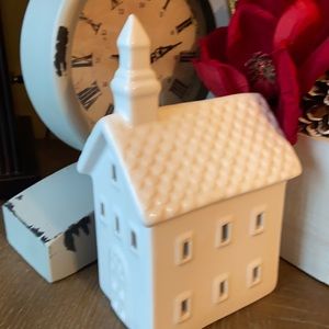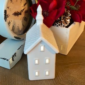 Gorgeous Christmas Holiday Creamy White Ceramic led lighted Church! Fantastic accent for your tabletop display book shelf or fireplace mantel hearth this holiday season! Battery operated with on off switch! Add a warm cozy glow with this beautiful ceramic church Pairs well with modern farmhouse Cottage French Country Boho or shabby chic vintage flea market decor styles