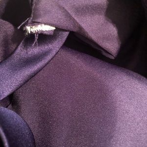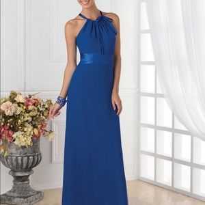 Christina Wu Grape/ Royal Purple Chiffon Full Length Bridesmaid Dress! High Halter Neckline/Semi fitted bodice/ gentle flat at hem with wide satin band at waist. Keyhole back with hook and clasp closures. Adjustable ribbon strap at neck can adjust the fit of the dress loose or tighter based on preference. Dress sized 14. Professionally altered to fit someone approximately to 34 bust,32 waist, 40 hips. String holding belt is detached on bottom left. Under left arm small area missing stitching as pictured. Small part of material is unstitched where neckline ribbon is. Last two pictures are from vendor website to show model in dress. Measurements laying flat: Total length from top of neckline is 53 inches, at belt 14.5 inches, pit to pit 17.25 inches. Only worn once. Few marks near front middle of button and mark on back bottom of dress. Coming from a smoke free home, original pictures, no filters.