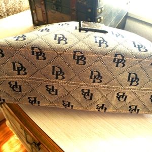 DOONEY BOURKE SIGNATURE JACQUARD CANVAS GRAY WITH BLACK LEATHER SINGLE HANDLE. CLEAN INSIDE & OUT.