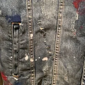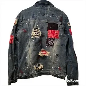 Street wear Patchwork, painted, distressed ripped denim jacket. Jacket is stretchy stretches about an inch and a half.