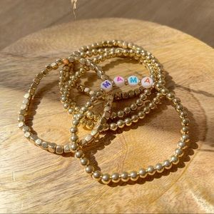 This set is too cute for us mama's! Comes with 3 round and 2 soft edged squared bracelets. One says, "mama" in 4 random colors. Please note that each bracelet will arrive as a mystery color option ( don't worry they are ALL cute! ).