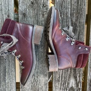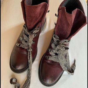 Sam Edelman Darrah hiking boots in gorgeous burgundy leather and suede. Features: woven laces with metallic tips, metallic eyelets, padded collar, stacked heel and round toe. In great condition.