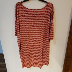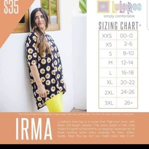 Lularoe Irma tunic shirt, perfect for wearing with leggings. Worn less than 5 times, still in very good condition no pilling. Color is red background with navy, yellow, and burgundy details. This material is so soft!!! Size chart in photos.