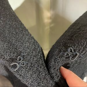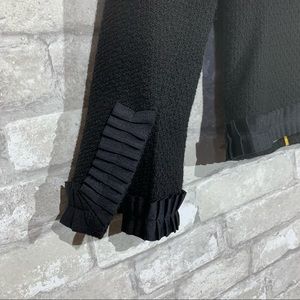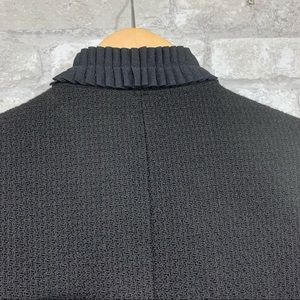 J. Crew Factory. Wool blend blazer. Pleated ribbon trim down front, bottom, pockets, and cuffs. Cuffs have a slit detail. Fully lined. Hook and loop closure. Mandarin collar. Black body with black trim. Twill weave. 39% wool, 34% polyester, 27% acrylic. Great preowned condition. No stains. No holes. No flaws, like new. Women's size 0. Please refer to measurements below for best fit.