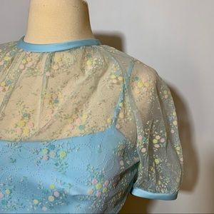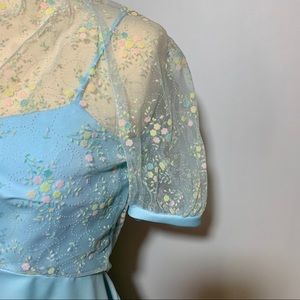 Beautiful and rare baby blue and pastel floral dress. Sheer overlay with intricate floral design in yellow, white, & pink.