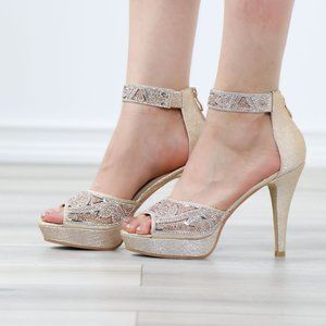 • Champaign Mesh Dress Heels with Silver and Rose Gold Rhinestones perfect for party and going out stiletto shoes. Can be worn to a wedding Party Outfit, Holiday Outfit, Christmas Outfit, New Years outfit, and clubbing outfits.