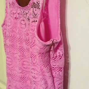 This dress is the cutest! It has a slip-like material w/ lace overlay, side zipper, and scoop back. I had trouble capturing the color, but would say it's a bright, classic pink color.