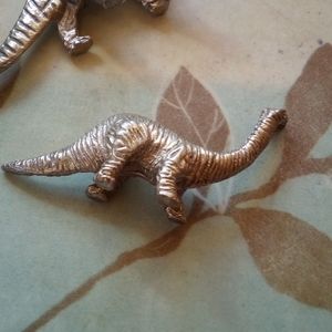2 sizes. Large and small. They are vintage. There are only 6 small so get them before they are gone. You get one dinosaur per order. Please choose on the buttons below. I think they are pewter. Some have differences so they are not all perfect or alike. Big one is about 3" long, small is 2" long. Bundle for deals.