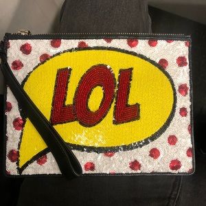 Laugh the night away and know that your items will be kept safe in this sequin and beaded embellished LOL graphic wristlet. - Wristlet strap - Top zip closure - Exterior features beaded and sequin detail throughout front, "LOL" graphic on front, solid color on back, label on back, and leather construction on back - Approx. 6.75" H x 9" W - Approx. 5.75" strap drop - Imported