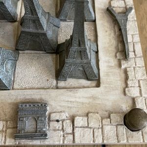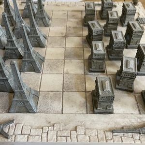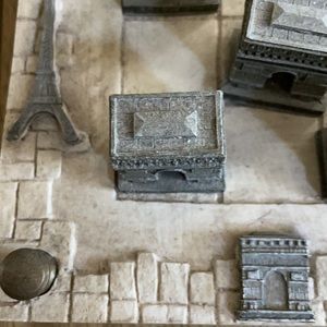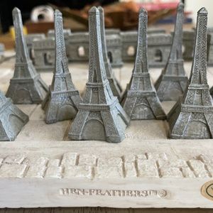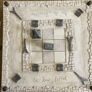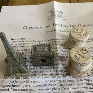 For the Paris lover…..checkers set by Hen Feathers, a leader in high-end home and outdoor decor. Each piece is hand-cast bonded marble with hand-rubbed patina enhancing its individual character. Beautiful on a coffee table and is a conversation piece. Play an afternoon game of checkers. Flip it over to play tic-tac-toe. Complete set. Measures 12”x12”. It’s a solid heavy piece weighing more than 5 lbs. Price reflects additional shipping charged to seller due to oversized item.
