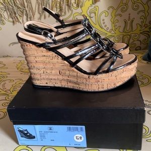Chanel black patent cork wedges. The insole just needs adjustment but still in good shape. Size 40 Euro 9 US.
