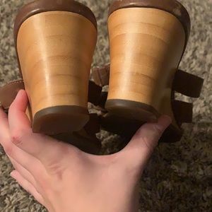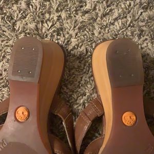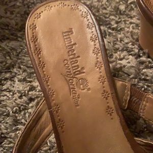 Timberland Comforia Genuine Leather Sandals size 8.5 in good condition. Some minor scratches on leather shown in photos. Bottoms of shoes show no major wear. Heel is 2.5 inches. All offers considered!