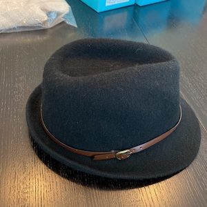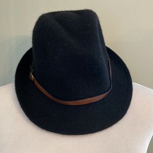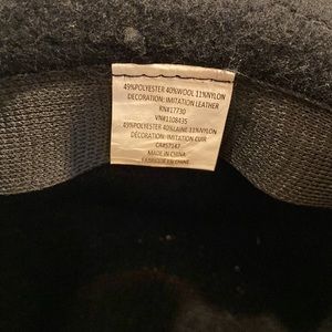 Great condition. Polyester, wool and nylon. Leather band with brass buckle.